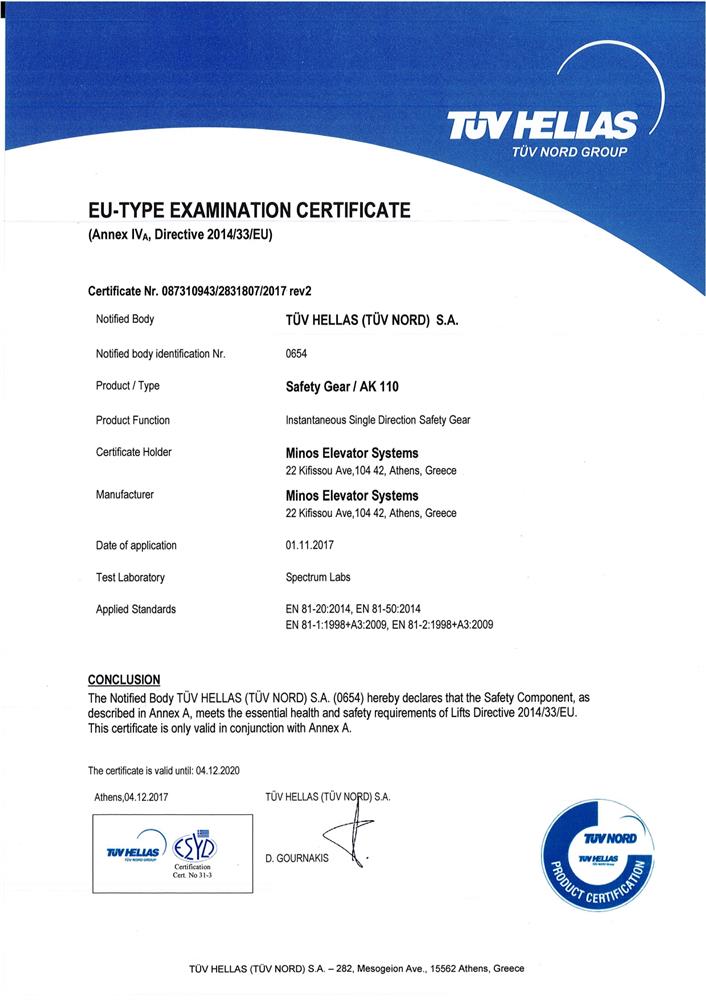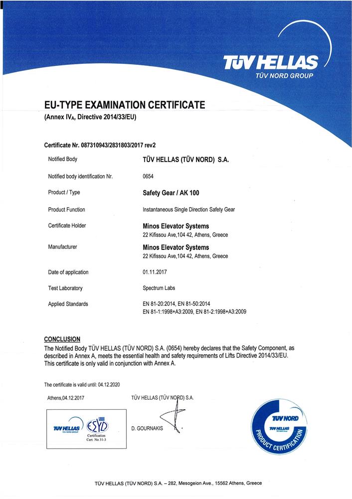 Έπειτα από τις επιτυχημένες εργαστηριακές δοκιμές και την εφαρμογή του σχετικού προτύπου EN 81-50, που αφορά εκτός των άλλων την κατασκευή εξαρτημάτων πέδησης για ανελκυστήρες, είμαστε στην ευχάριστη θέση να σας ενημερώσουμε για την έκδοση των πιστοποιητικών εξέτασης τύπου για όλους τους τύπους ακαριαίας αρπάγης που κατασκευάζουμε.
