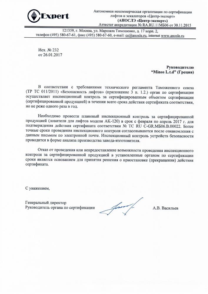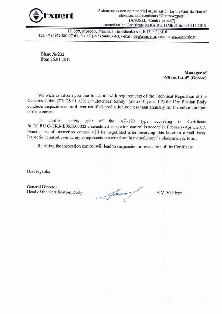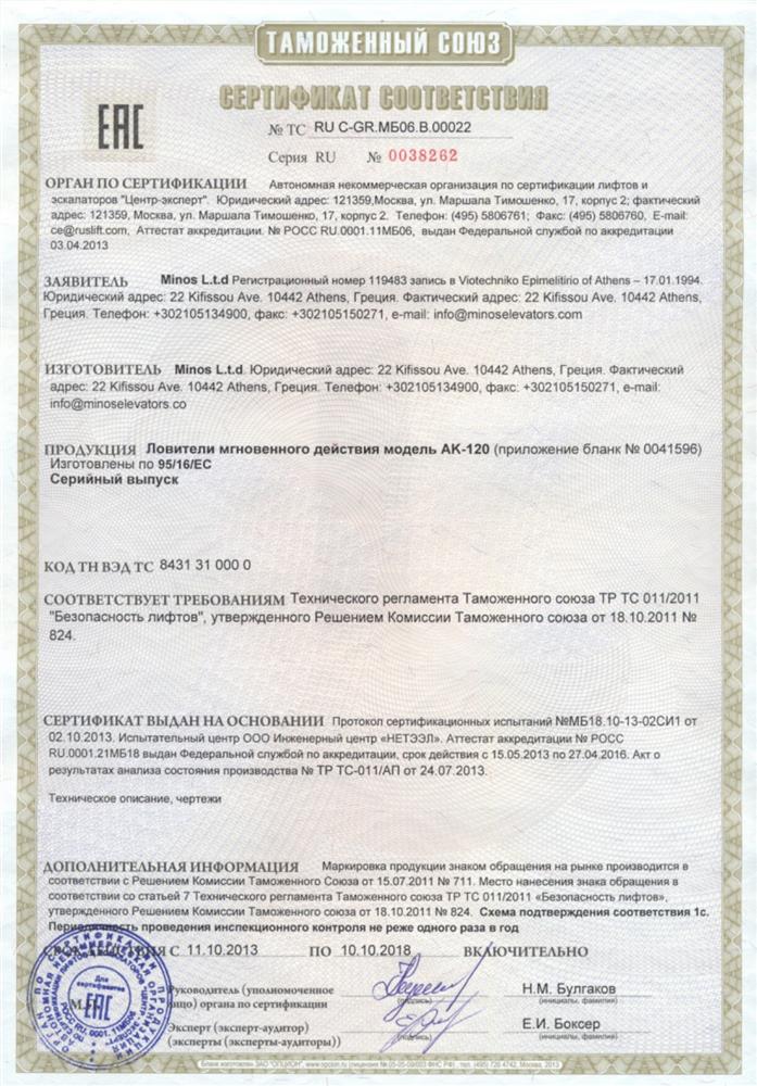 Σε συνεννόηση με φορέα ελέγχου και πιστοποίησης από την Ρωσία, ολοκληρώνει με επιτυχία τον τεχνικό φάκελο και τις δοκιμές που απαιτούνται. Το πιστοποιητικό του ακαριαίου συστήματος πέδησης ΑΚ-120 της εταιρείας ΜΙΝΩΣ είναι πλέον διαθέσιμο για εμπορία και χρήση στην αγορά ης Ρωσίας!