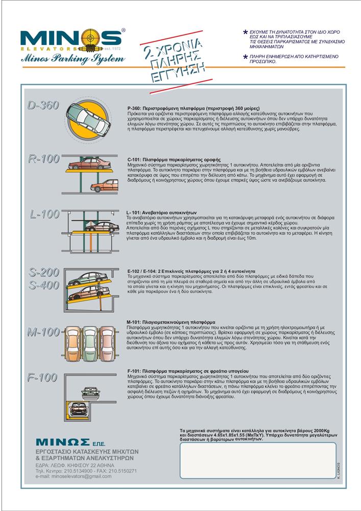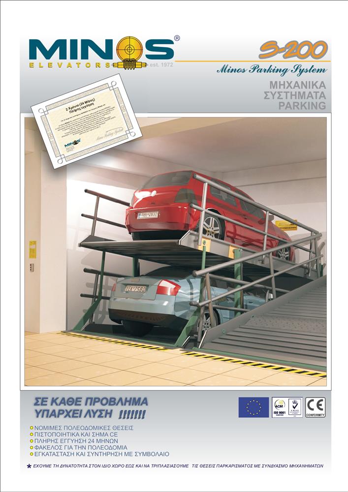 Οι ολοένα αυξανόμενες ανάγκες για την βέλτιστη εκμετάλλευση χώρων, ωθεί την εταιρεία να επεκτείνει τις δραστηριότητες της στον σχεδιασμό καινοτόμων μηχανημάτων. Πρόθυμη και ικανή να δώσει λύσεις, η ΜΙΝΩΣ ξεκινάει την κατασκευή μηχανικών συστημάτων μετακίνησης αυτοκινήτων, τα οποία βρίσκουν εφαρμογή στην πλειοψηφία των κτιρίων. Με τον πολλαπλασιασμό των θέσεων στάθμευσης και την δυνατότητα περιστροφής 360˚, το παρκάρισμα γίνεται πιο εύκολο από ποτέ.